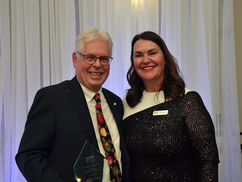 BC Fruit Growers Association general manager Glen Lucas, who retires in March, was honoured for 35 years of service to the sector with the BCAC Excellence in Agriculture Leadership award.
