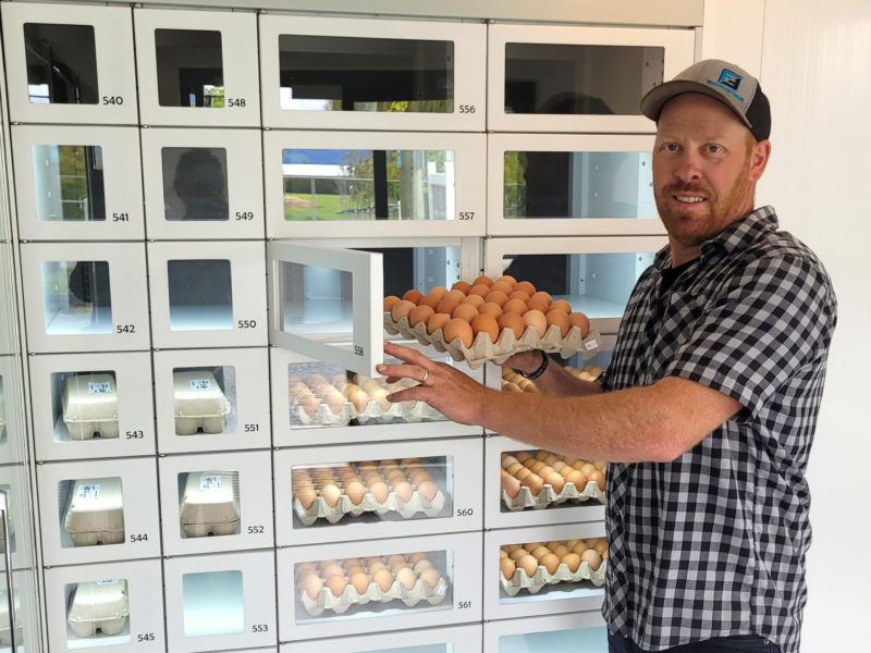 Berry Bounty Farms installed the Innovend machine last July, allowing it to display more than a dozen products from berries to eggs and honey in individual climate-controlled compartments with see-through doors.
