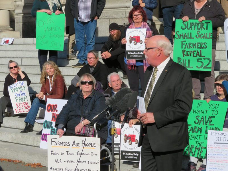 Earlier in the day, close to 100 people rallied at the back of the legislature demanding the repeal of Bill 52, passed last November, which limits house sizes and kinds of residences permitted in the ALR.