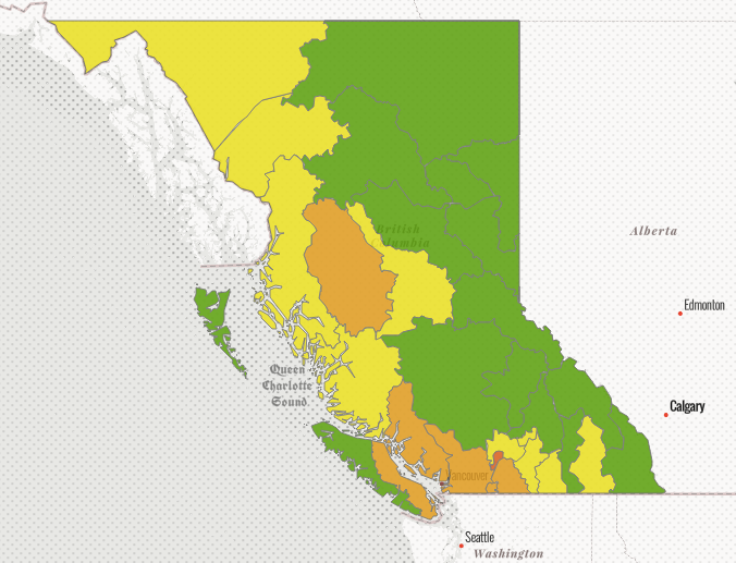 The dramatic shift in moisture conditions across the province is evident on the provincial drought map. Just one basin in the province, the Coldwater between the Nicola and Similkameen, remains at the highest drought rating of extremely dry. Fifteen others, primarily those in the eastern half of the province as well as western Vancouver Island and Haida Gwaii are rated normal. Ten are dry, and are primarily located along the west coast of the province’s mainland. The remaining six are very dry, and stretch from eastern Vancouver Island to the Similkameen.