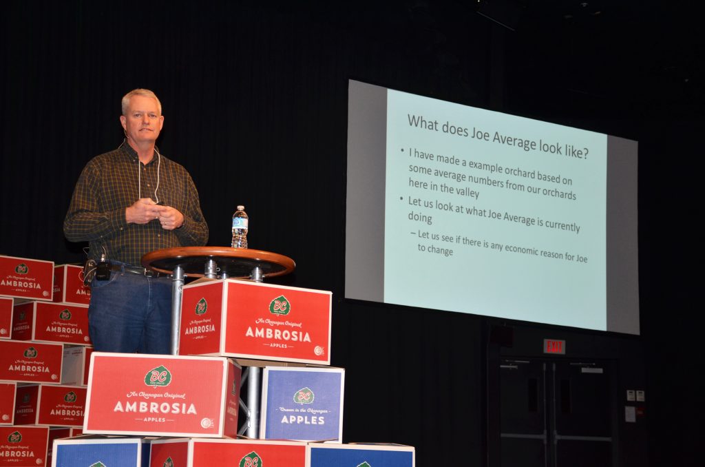 Honeycrisp, the most profitable variety for growers in the current market, can suffer up to 30% losses in the orchard. Grower skill varies greatly, with apple production ranging from an average of 30 bins an acre to more than 80. The difference shows the need for field support to assist growers, service for which the BC Fruit Growers Association honoured Markgraf when it presented him with its award of merit in 2017.