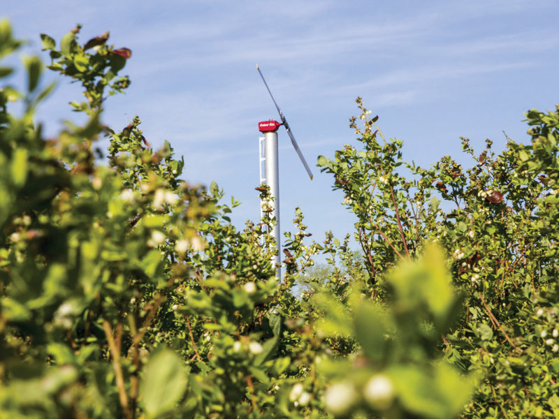 It turns out the noise was coming from two Orchard-Rite wind fans that were being used to protect blueberries from radiant frost damage during a late spring cold snap. When the air cools at night, frost accumulates on plant surfaces causing damage to the delicate buds. If severe enough, it can kill the plants outright.