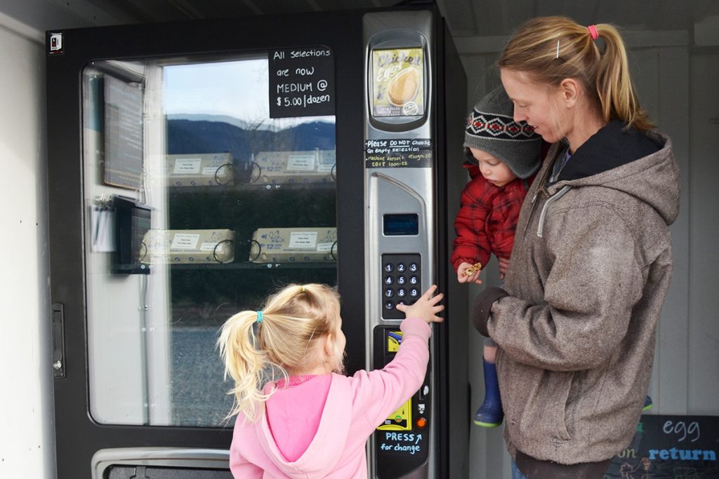 They looked online and considered purchasing a machine from China, but local vending machine supplier Langley Wholesale Ltd. offered to customize a second-hand machine complete with a lifting arm so that egg cartons are rolled onto a shelf then lowered to the bottom opening of the machine without dropping or fear of breakage.